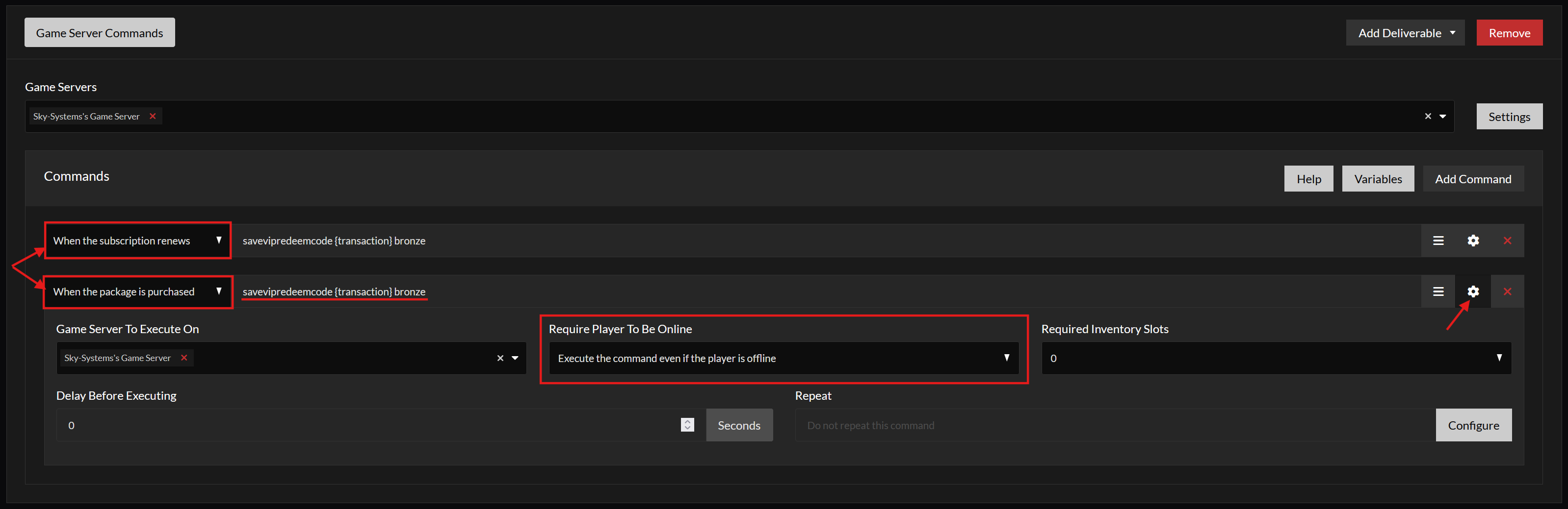 - Select your game server again here and make sure that the command is executed even if the player is offline (if you require the player to be online and the player is online, it may not work)